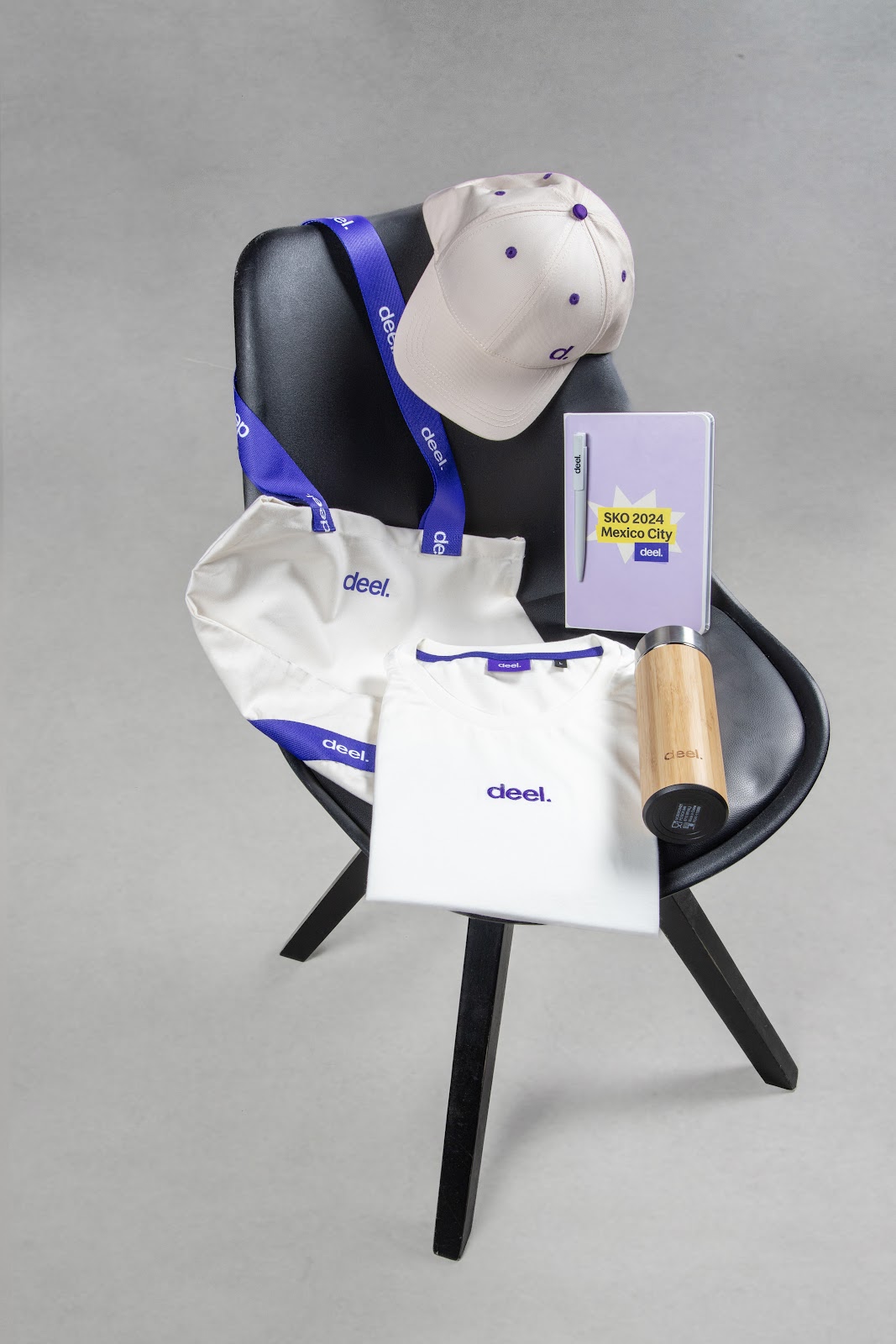 One of the most detailed and carefully curated kits we’ve built came from our collaboration with Deel for their global SKO event in Mexico City. This kit was designed as an event-ready pack a: practical, polished, and tailored for a high-energy week. It featured a crisp white t-shirt, a bamboo thermos for long event days, a branded cap, notebook and pen for taking notes during sessions, a lanyard for access, and a clean tote bag to carry it all. Every item was selected not just for usefulness, but to create a consistent, immersive brand experience that made each participant feel immediately connected and equipped.