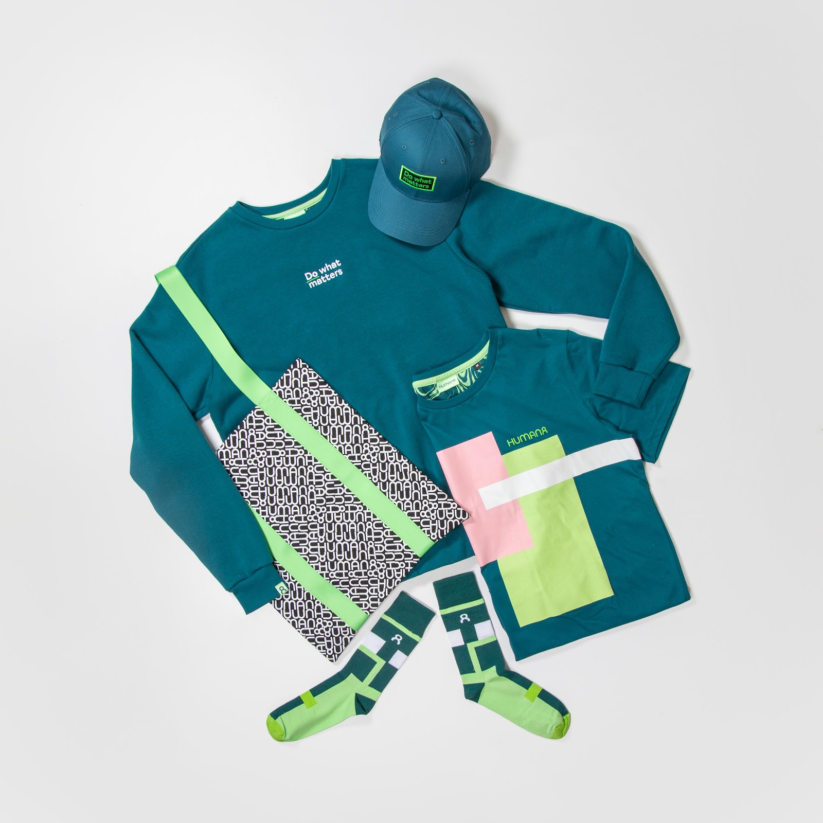 Human8’s kit used color, texture, and words to tell a story. With a teal sweater featuring the slogan “Do What Matters”, a matching graphic tee, patterned socks, a stylish tote, and a branded cap, this kit was a celebration of creative identity and shared values.