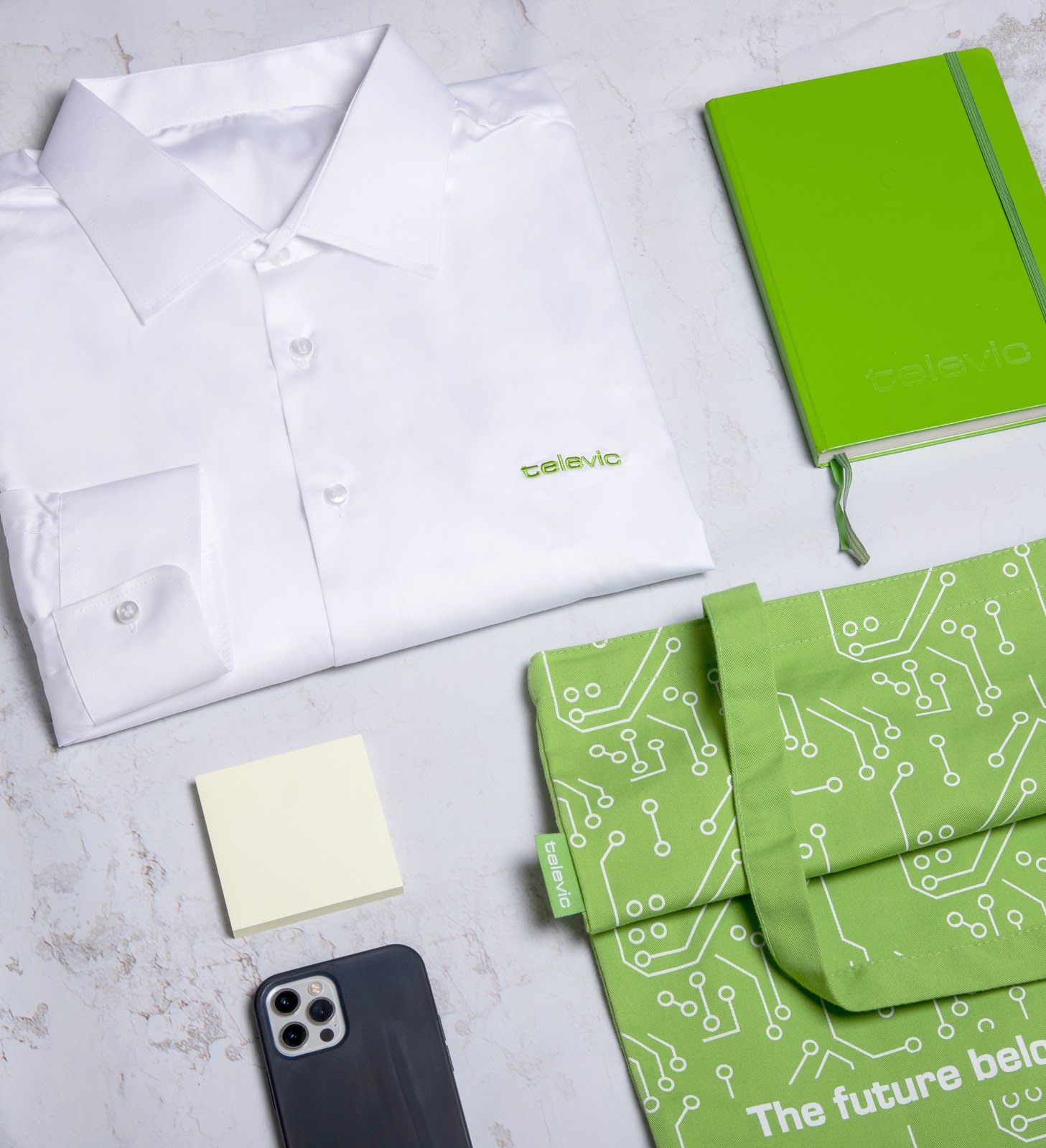 For Televic, the goal was to make a strong and thoughtful first impression and their kit did exactly that. Featuring a white embroidered business shirt, a bright green notebook and pen, and a circuit-printed tote bag with the phrase “The future belongs to the curious,” this set was clean, modern, and purpose-driven. Every detail reflected the company’s focus on technology and innovation, making new hires feel aligned with the brand from day one.