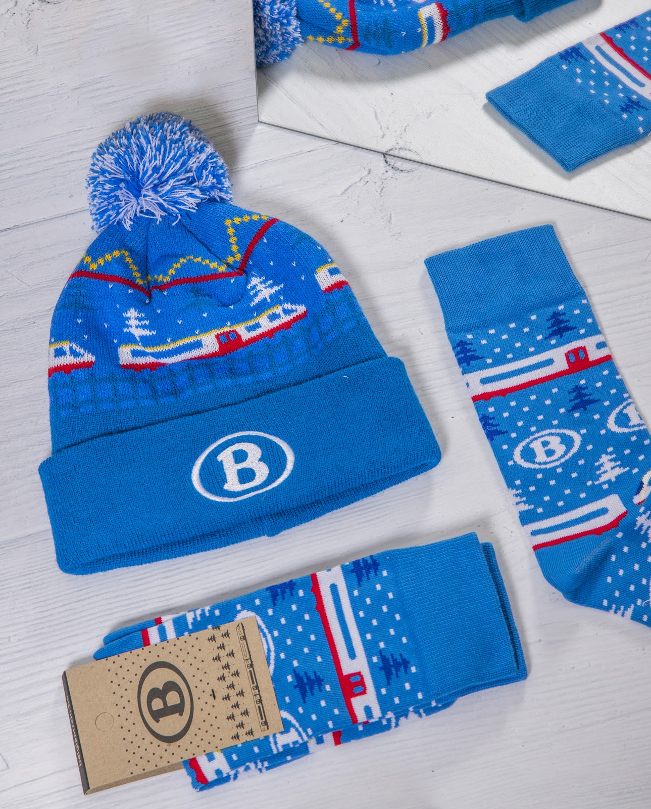 A cozy and playful winter kit designed for NMBS, the Belgian railway company. It featured custom-knit socks and beanies with cheerful winter graphics in red, navy, and white. Perfect for spreading holiday spirit and keeping employees warm on the go.