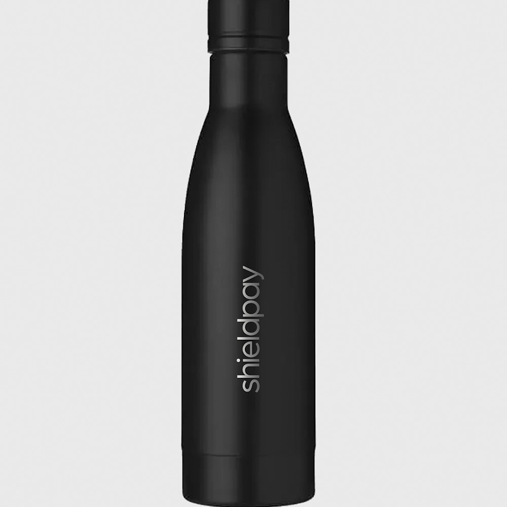 A sleek, branded insulated water bottle keeps hydration levels high and environmental impact low, showcasing the company’s commitment to health and sustainability.
