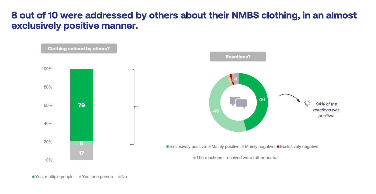 8 out of 10 respondents reported being addressed by others when wearing NMBS clothing, with nearly 94% of these interactions being positive.