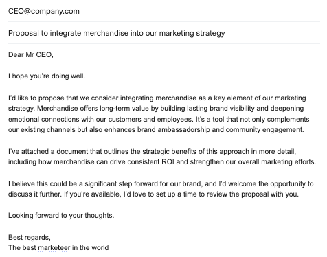 This blog post is written from the perspective of a marketing manager advocating for the inclusion of merchandise in a company’s marketing strategy. It’s designed to provide insights and rationale for why merchandise should be considered a core element in any comprehensive marketing plan. Whether you’re a C-level executive, VP, director or part of the strategic decision-making team, this post offers a deep dive into the long-term benefits and strategic impact that merchandise can bring to our brand. Through this lens, you’ll understand why integrating merchandise is not just a tactical choice but a vital part of building sustained brand loyalty and engagement. example mail
