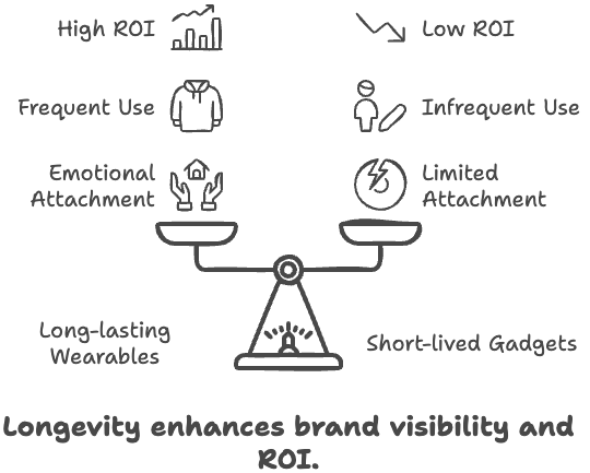 In contrast, gadgets like pens, stress balls, or low-cost tech accessories often have a short lifespan. They may be used a few times before being forgotten or thrown away. Even useful gadgets like charging cables are less likely to create the same emotional attachment as wearable items.